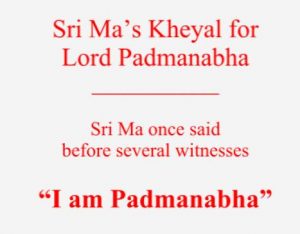 “It is Mother’s kheyala that Sri Padmanabha Swami’s vigraha installation should take place on September 29th, which is Mahanavami (of Durga Puja). However, I appreciate that it will not be possible for you to be present, because Vijayadasami (the day after Navami) is the most important celebration for you. If Rani Saheba is there, she can represent the family.”